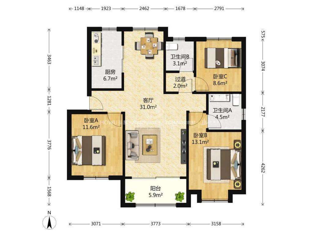厅室3室2厅2卫1阳台