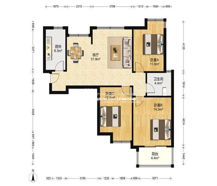 厅室3室2厅1卫1阳台