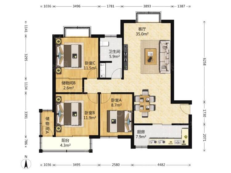 厅室3室2厅1卫1阳台
