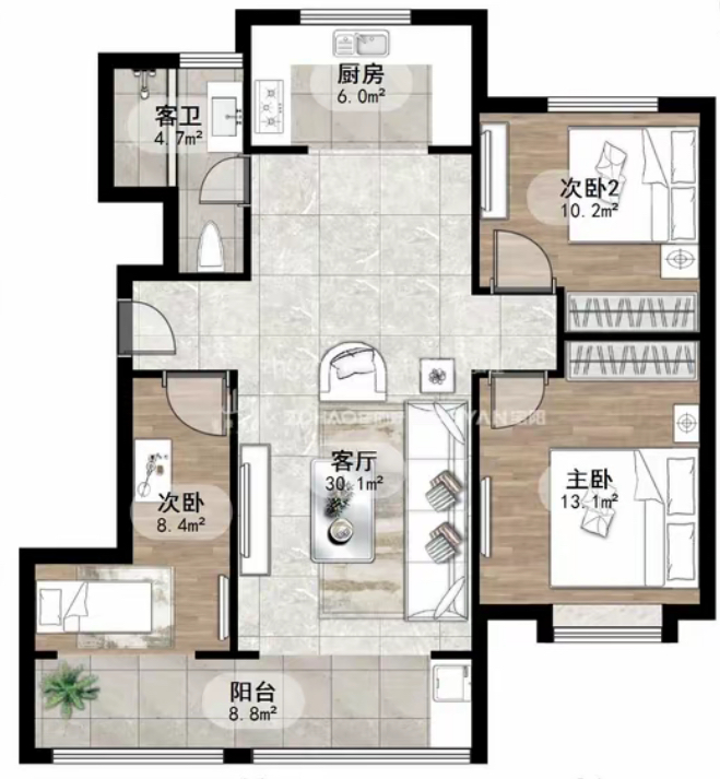 厅室3室2厅1卫1阳台