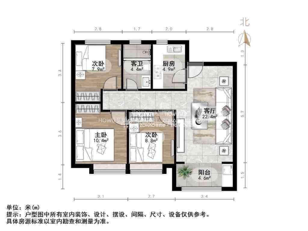 厅室3室2厅1卫1阳台