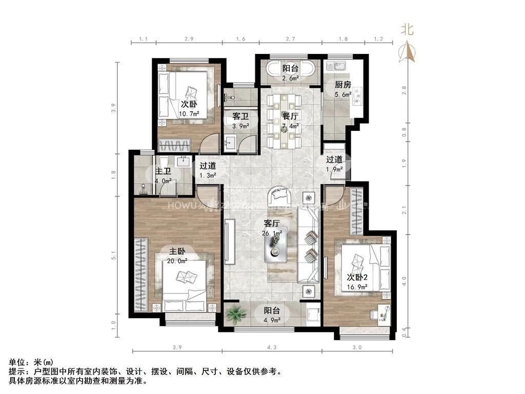 户型:3室2厅1厨1卫1阳台 ,朝向:南北,格局方正,南北通透,使用率超赞