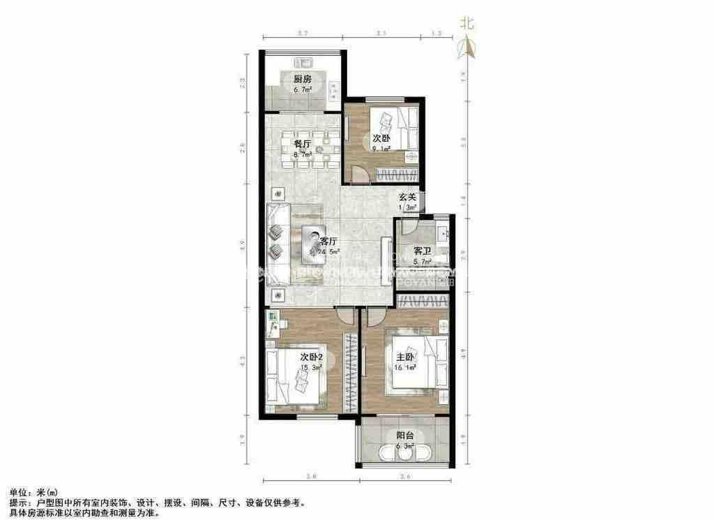 厅室3室2厅1卫1阳台