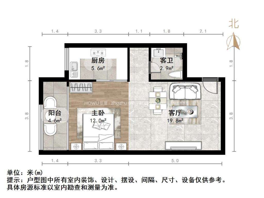 厅室1室1厅1卫1阳台