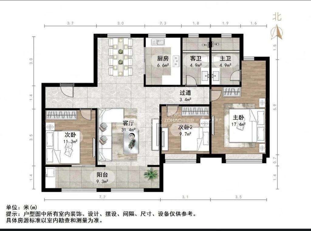 厅室3室2厅2卫1阳台