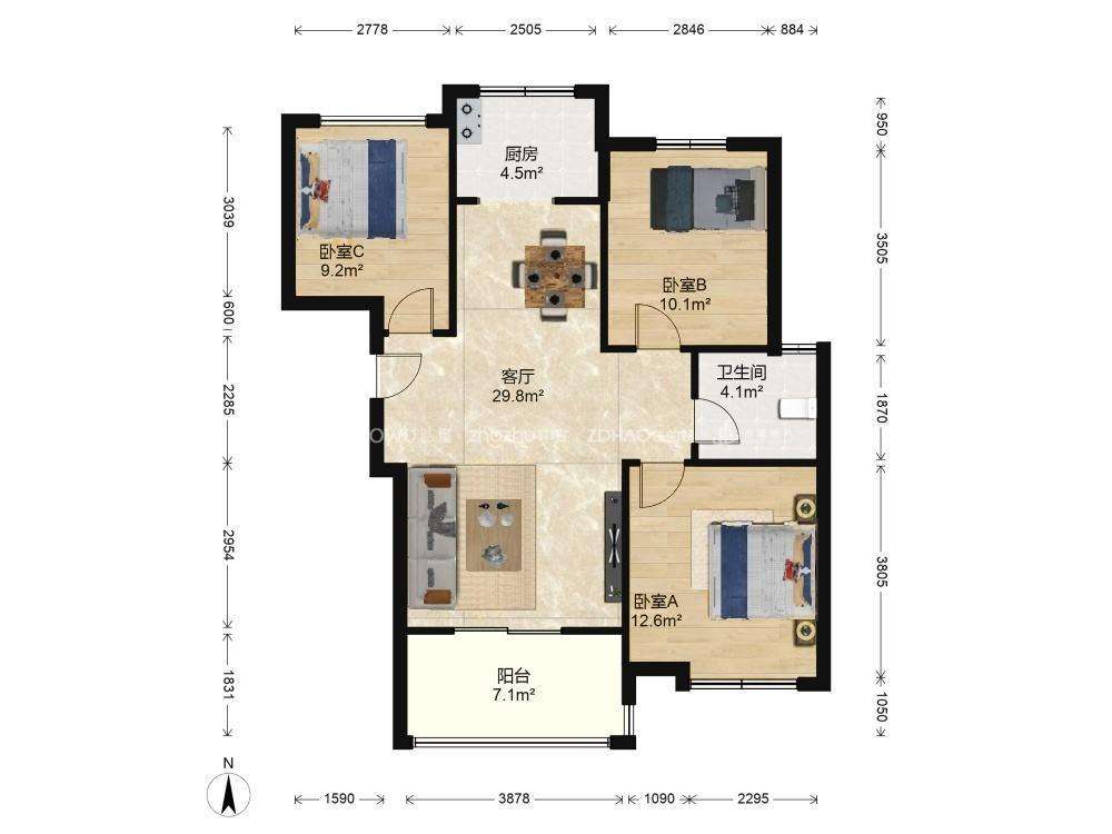厅室3室2厅1卫1阳台