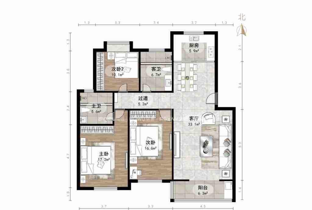 厅室3室2厅2卫1阳台