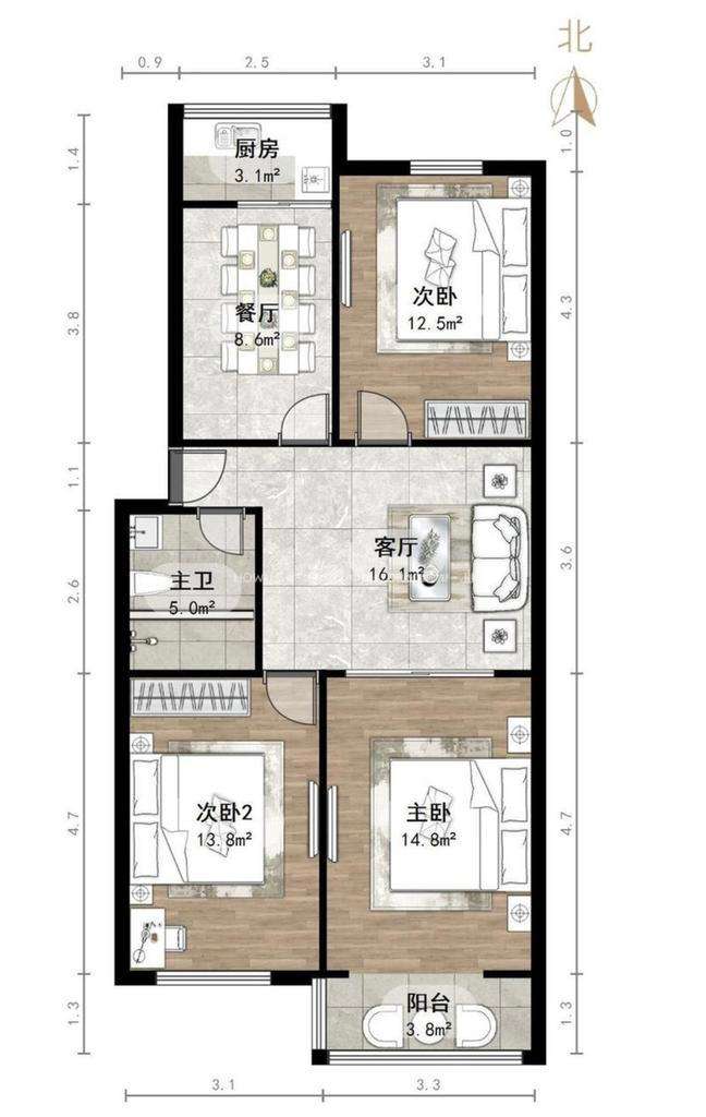 厅室3室2厅1卫2阳台