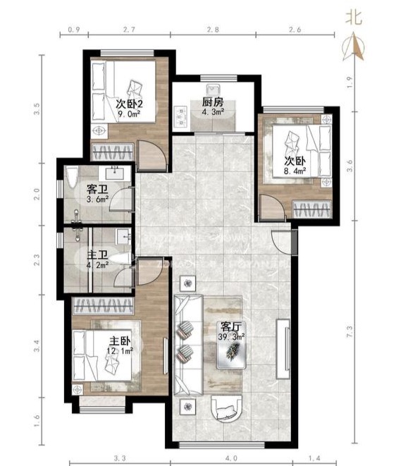 厅室3室2厅2卫1阳台