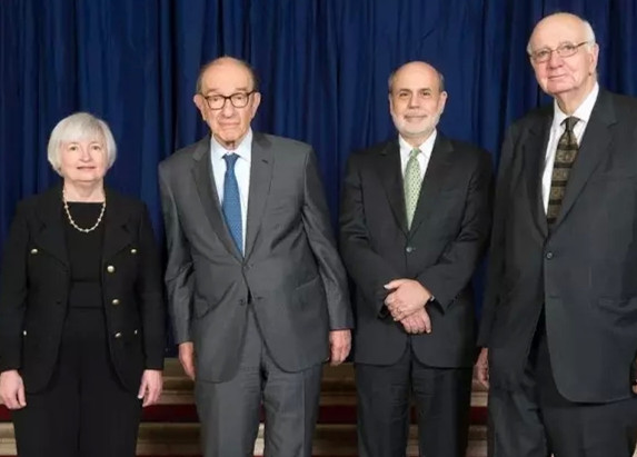 ▲美联储最近的四任主席,沃尔克(右一)、格林斯潘(左二)、伯南克(右二)和耶伦(左一)